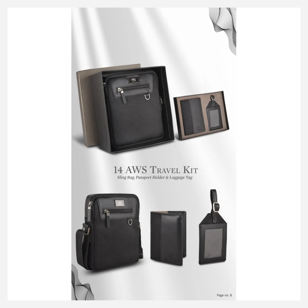 The AWS Travel Kit Gift Set is a premium and thoughtfully designed collection tailored for modern professionals and frequent travelers. This elegant travel ensemble includes a stylish sling bag, a matching passport holder, and a coordinated travel tag, all meticulously crafted from high-quality imported leatherette material and presented in a luxurious rigid gift box.