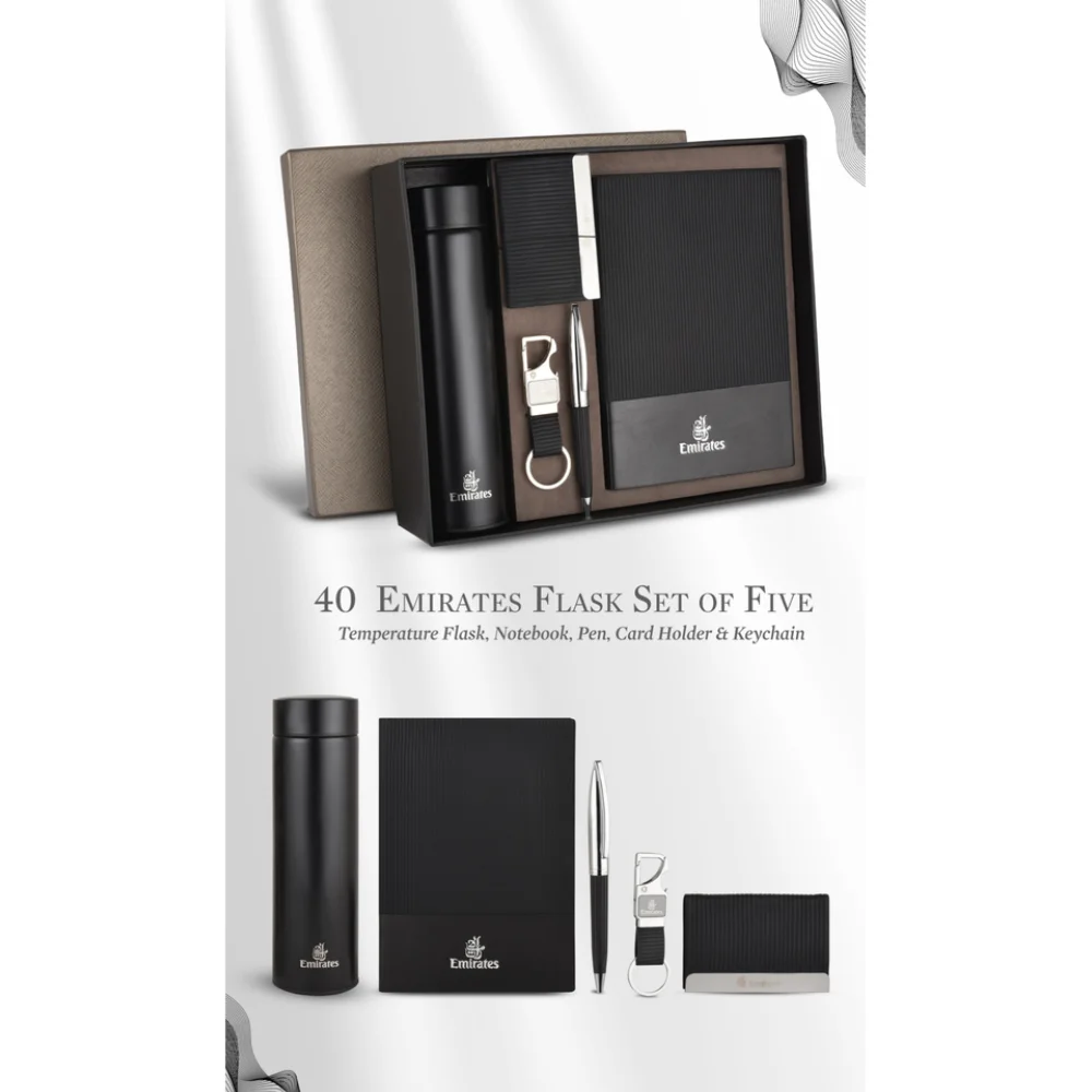 The Emirates Set of 4 Joining Kit is a premium and versatile corporate gifting ensemble designed to make a powerful first impression. This elegant collection includes a premium notebook, a 750 ml stainless steel flask, an imported keychain, a sleek metal pen, and a stylish card holder, all beautifully arranged in a luxurious rigid gift box that exudes sophistication and professionalism.